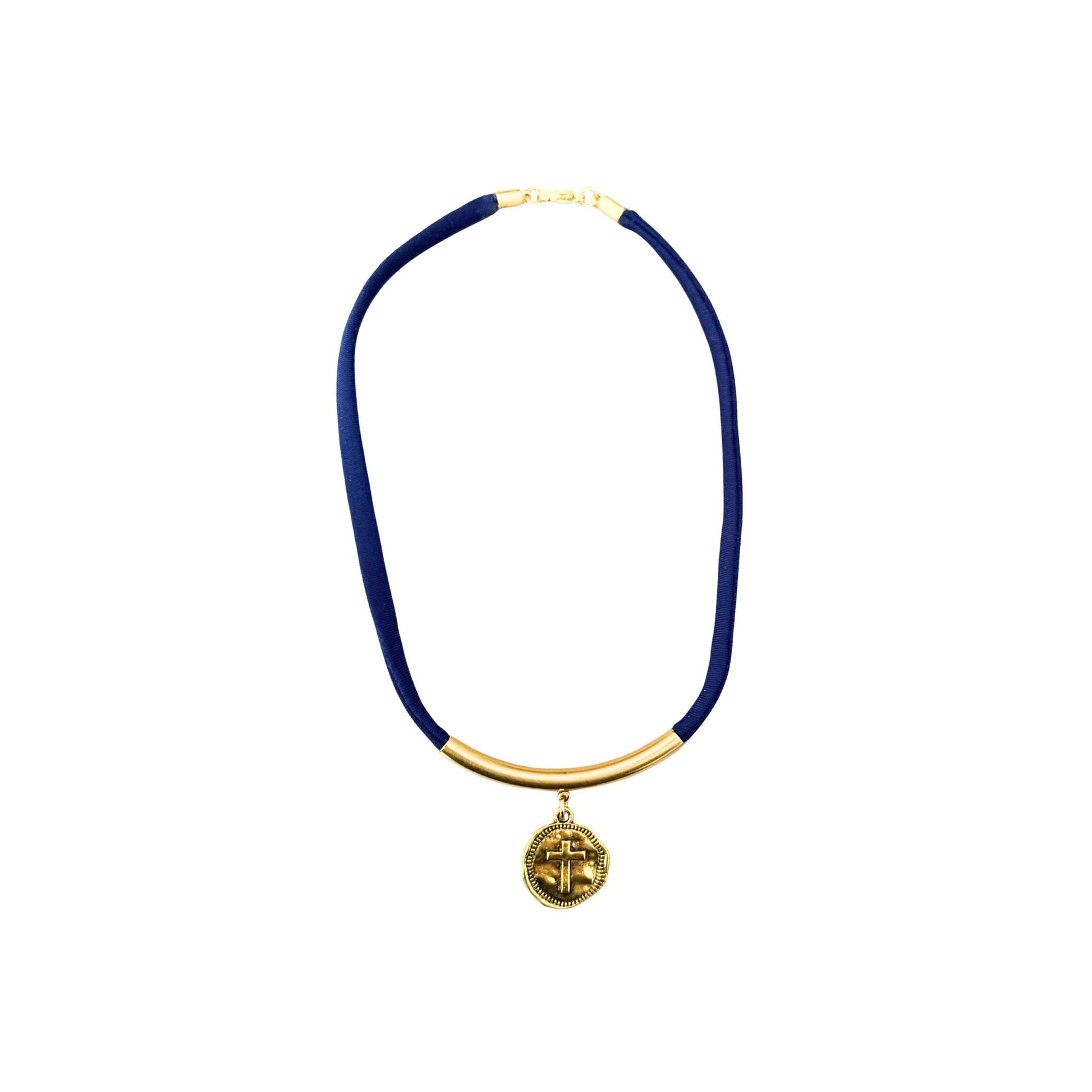 Collar corto de cordón elástico, cómodo y fácil de poner, con separador dorado y cruz central. Un diseño sencillo pero con carácter, perfecto para llevar solo o combinado con otros collares y crear capas con personalidad.