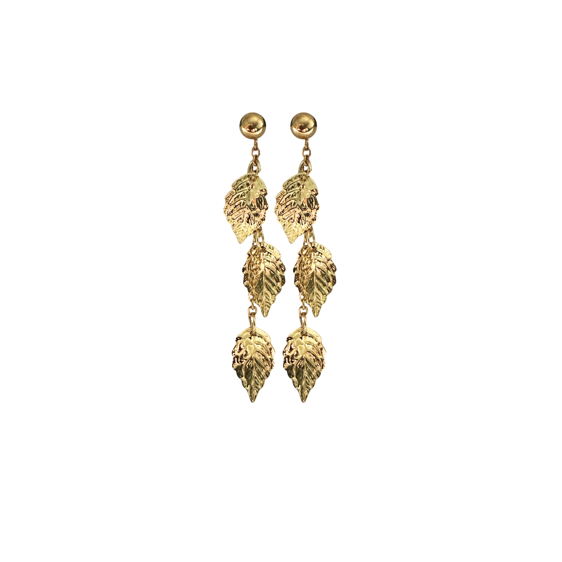 Pendientes largos con diseño en cascada y hojas de latón bañadas en oro de 18 quilates. Ligeros, elegantes y con movimiento, están pensados para destacar sin recargar.